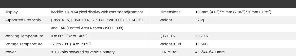 | Protocoles pris en charge | J1850-41.6, J1850-10.4, ISO9141, KWP2000 (ISO14230), CAN (ISO11898) |