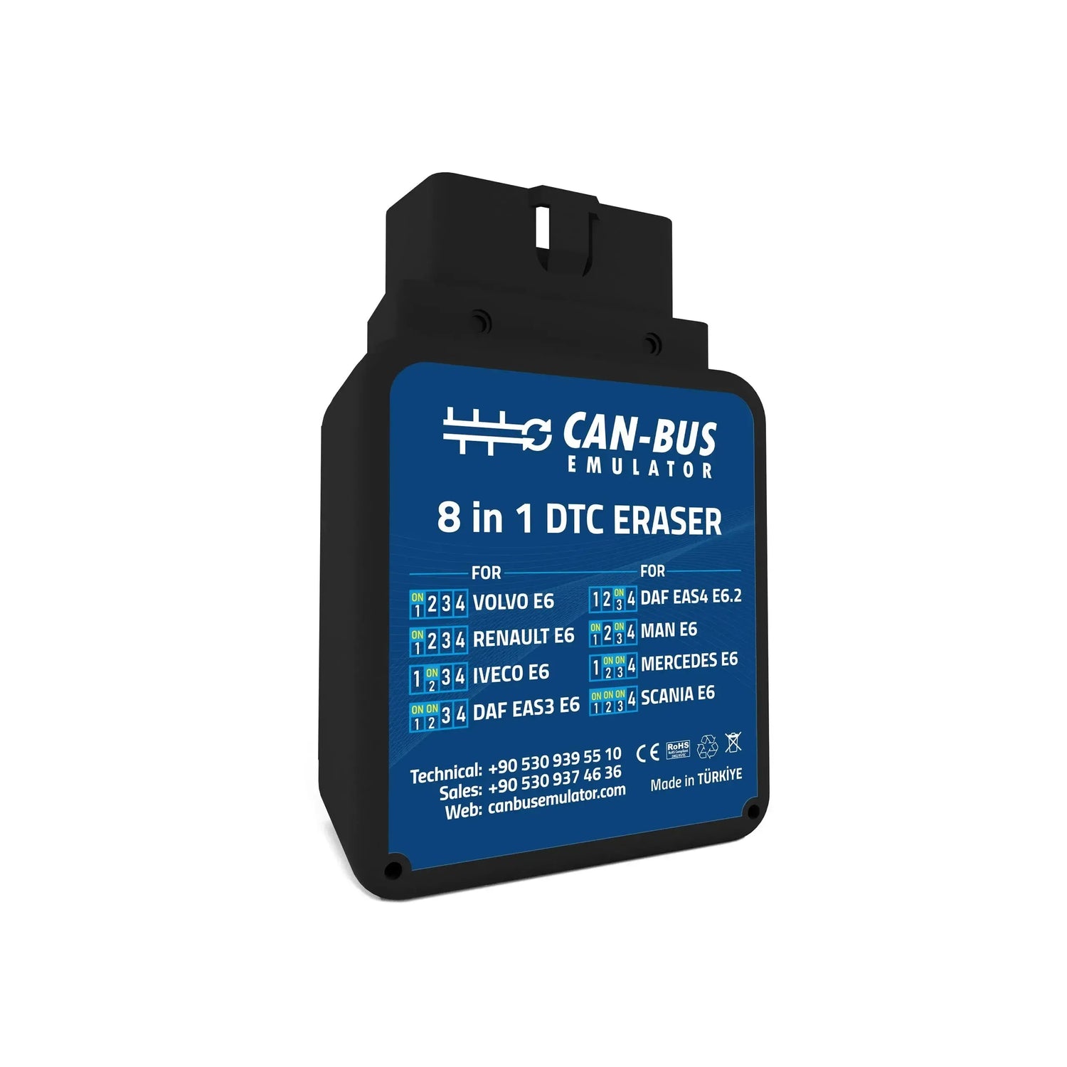 Le Effaceur de codes d’erreur 8 en 1 (DTC) est un module de diagnostic conçu pour effacer les codes d’erreur des camions équipés de moteurs Euro 6 et Euro 6.2. L’appareil fonctionne comme une solution autonome et se connecte directement au port OBD du véhicule. Cet effaceur est compatible avec une large gamme de marques de véhicules, notamment DAF, Iveco, MAN, Mercedes-Benz, Renault, Scania et Volvo. En réglant correctement les interrupteurs sur le module, le protocole spécifique à la marque est sélectionné, permettant à l’utilisateur de passer aisément d’un véhicule à un autre.